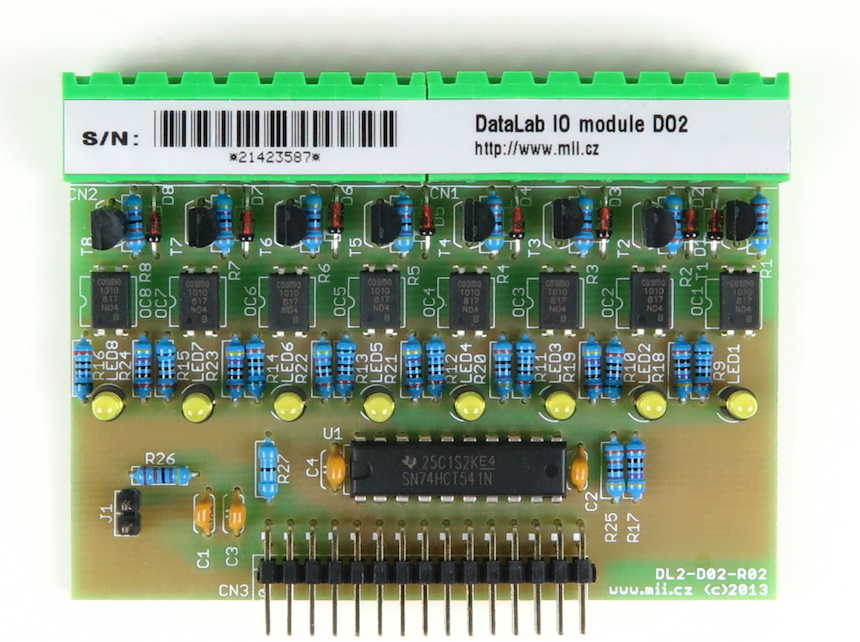 Modul DO2 obsahuje osm digitálních spínacích výstupů s otevřeným kolektorem. Výstupy jsou navzájem galvanicky odděleny. Sepnutý výstup je indikován LED.