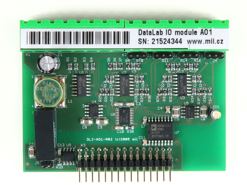 Modul analogových výstupů má 8 napěťových výstupních kanálů s 12bitovým D/A převodníkem v rozsahu 0 až 10 V. Čtyři kanály je možné pomocí propojek na desce přepnout do režimu proudových výstupů s rozsahy 0 až 20 mA.