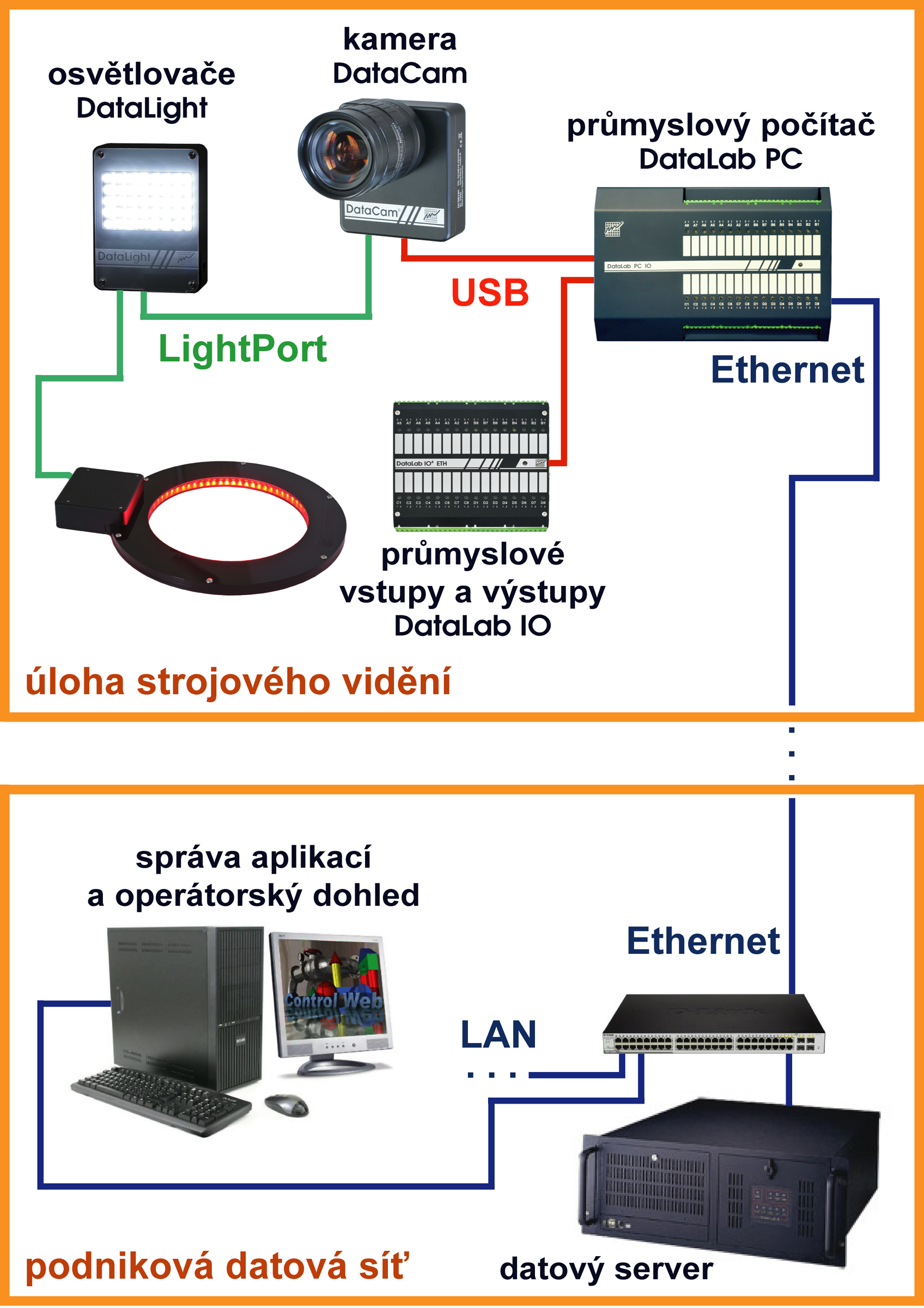 jednotky průmyslových vstupů a výstupů, kamery, případně celé řídicí