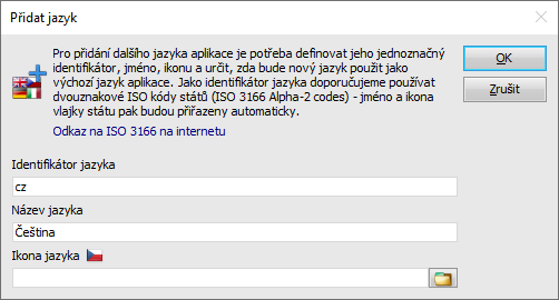 Jazyk aplikace přidáme tak, že klikneme na nástroj Přídat jazyk a vyplníme položky zobrazeného dialogového okna. Pokud jako identifikátor jazyka použijete dvouznakový ISO kód, pak je, pokud již není vyplněno pole Název jazyka, doplněn název státu a Ikona jazyka. Samozřejmě lze název i ikonu zvolit podle potřeb. Název a ikona budou pak nabízeny v přístroji pro volbu jazyka language_selector. Pro programové přepínání a identifikaci nastaveného jazyka aplikace je však rozhodující definovaný identifikátor jazyka.