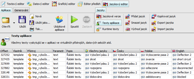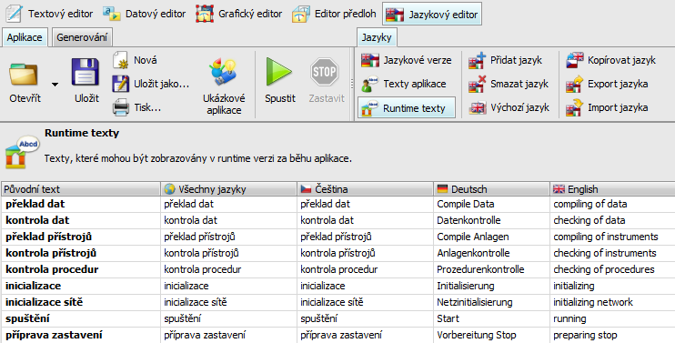 Jazykový editor má tři části - editor jazykových verzí, editor textů aplikace a editor zabudovaných textů, které zobrazuje Control Web za běhu aplikace.