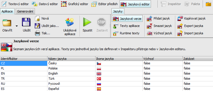 U vícejazyčných aplikací je také Inspektor přístrojů rozšířen o záložku Jazykové verze, které je umístěn editor, který umožňuje editovat texty použité v rámci přístroje.