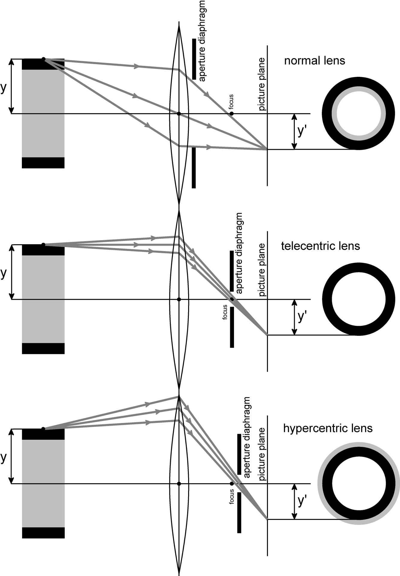The projection principle of normal, telecentric and hypercentric lens