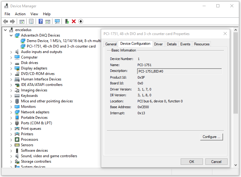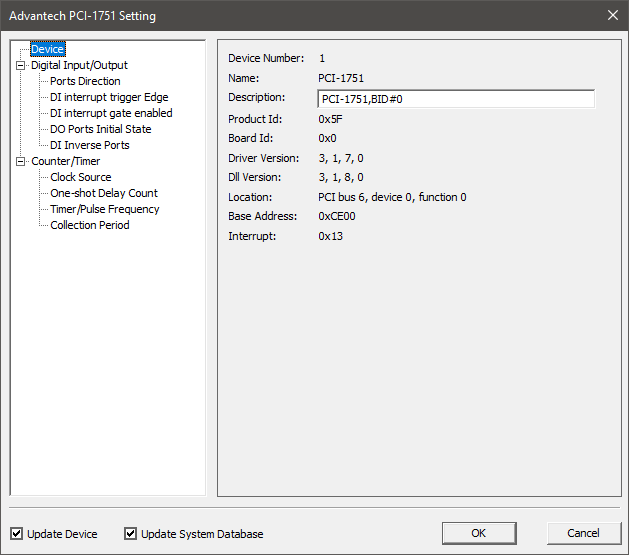 se skládá z typu zařízení a ID desky, např. PCI-1751,BID#0.