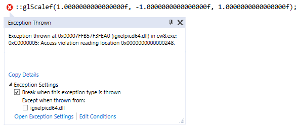 • Jedna z posledních detekovaných chyb se vyskytuje v ovladačích Intel. V panelech s vykreslovačem OpenGL a 2D vektorovou kresbou se při pohybech myši nad objekty prochází struktura kresby, aby se zjistilo, nad kterými objekty se kurzor myši nachází, aby se mohl v případě potřeby změnit a indikovat tak možnost stisknutí tlačítka myši. Při velkém množství grafických dat se při tomto ovladač občas zhroutí.