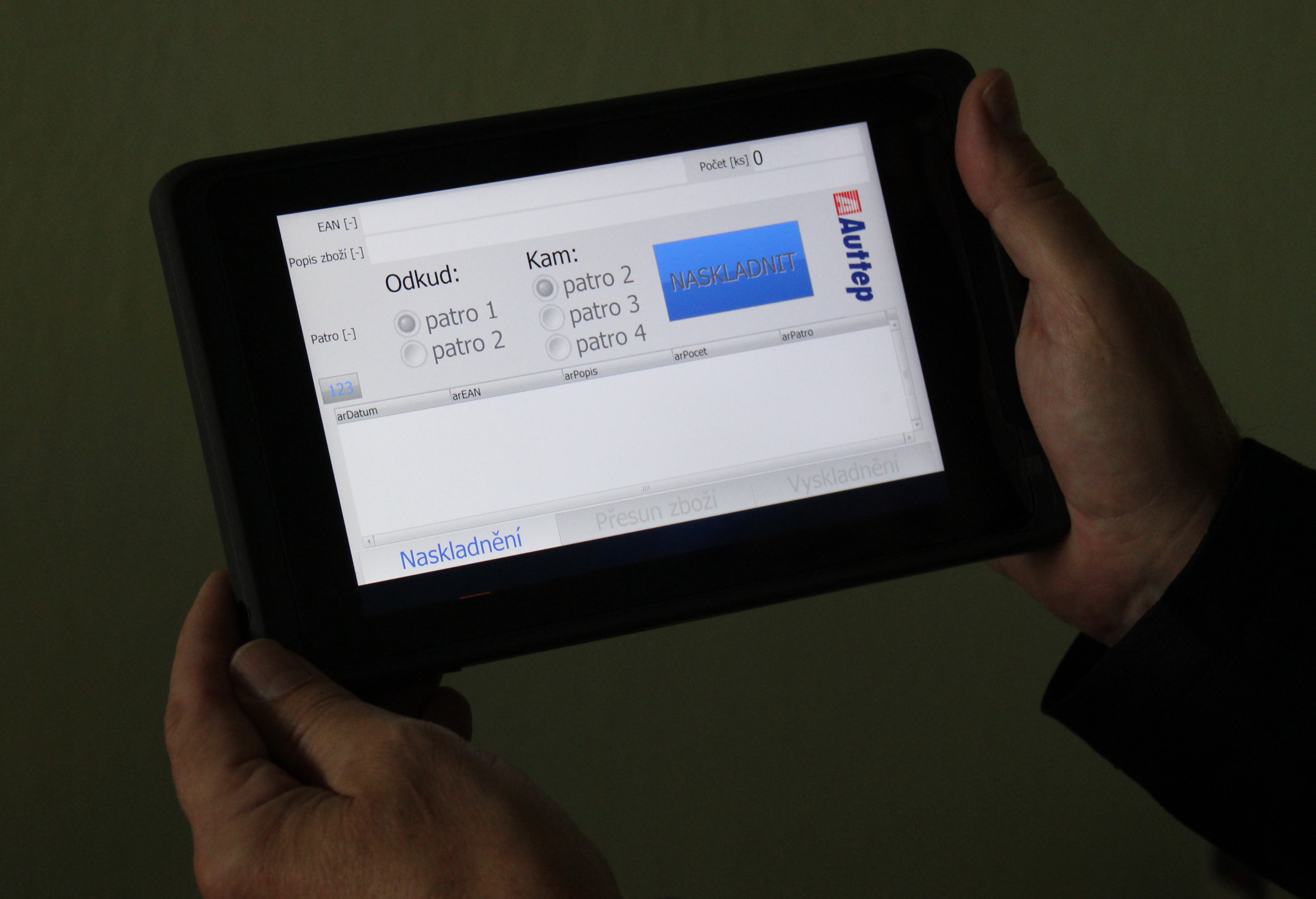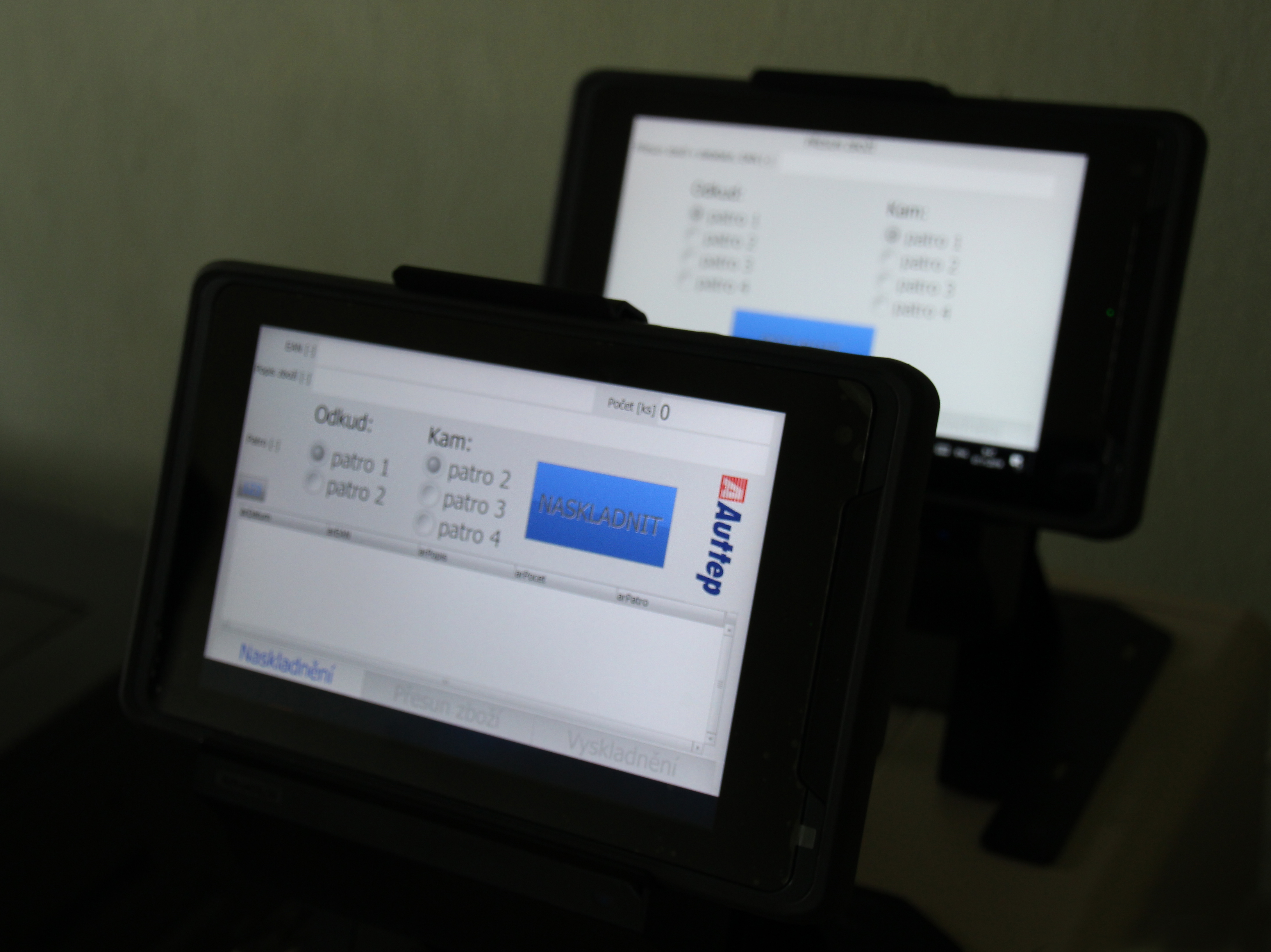 Portable terminals make it easy to pick up goods from the warehouse by picking up barcodes. They also run applications in the Control Web environment. The applications are operated via touch screens and have a simple and clear graphical user interface. Goods are transported by elevator on several floors. Throughout the premises the terminals are connected wirelessly via Wi-fi. The supplier of the pallet transport system is TMT spol. s.r.o., Chrudim.