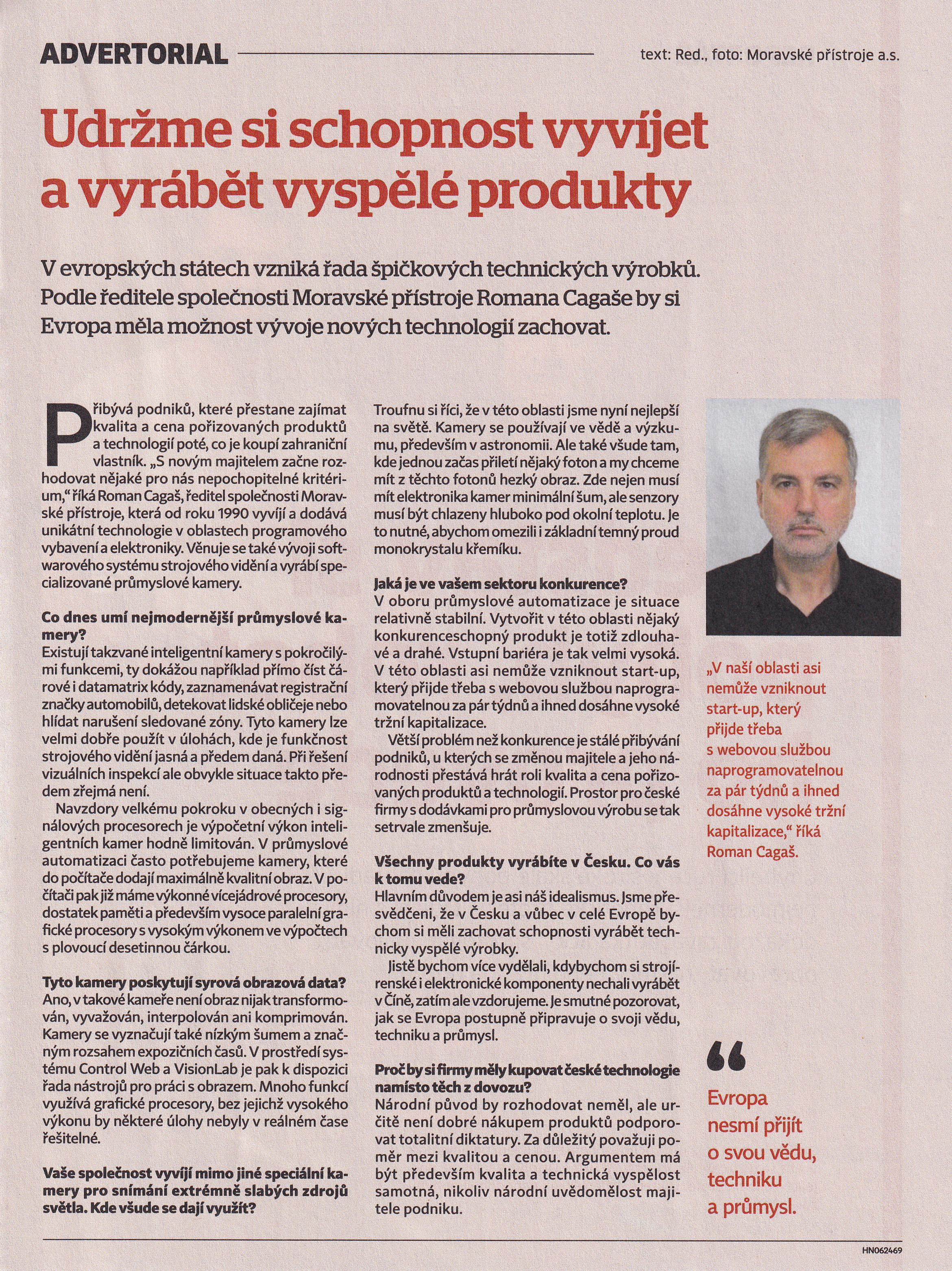 Rozhovor redakce Hospodářských novin s Romanem Cagašem, zástupcem společnosti Moravské přístroje a.s. Text: Hospodářské noviny, Foto: Moravské přístroje