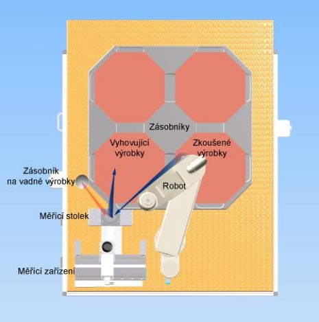 zásobníků pro měření výrobků a odebrání změřených kusů včetně