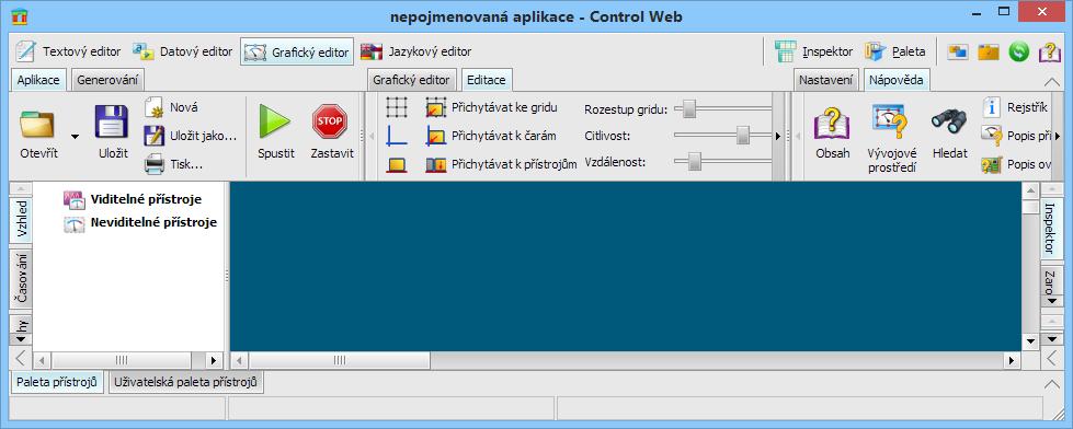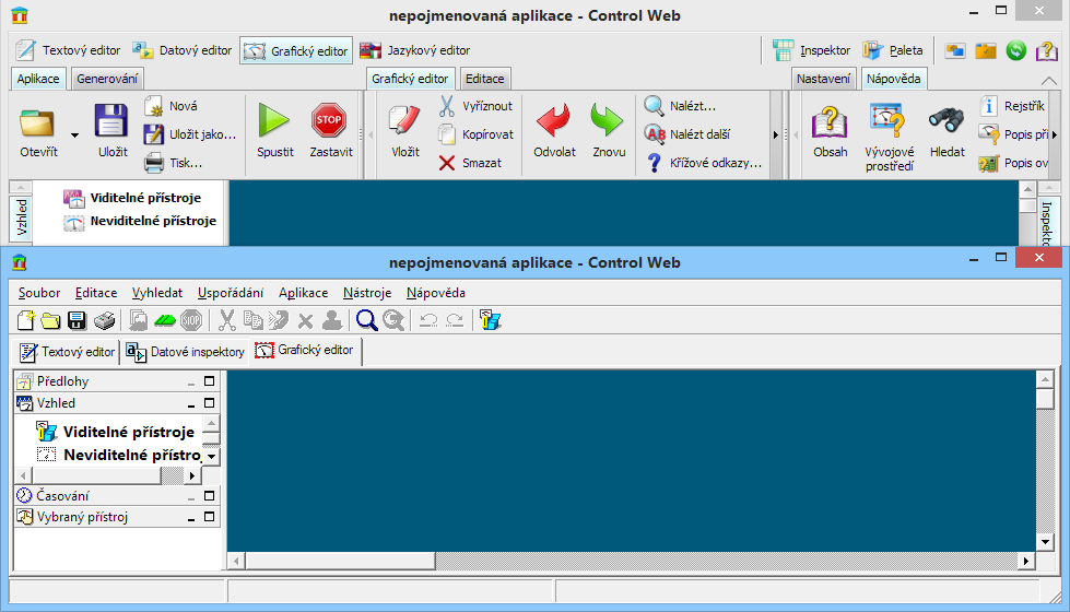 • Pokud jsou skupiny ribbonů nebo nástrojových panelů umístěny u okraje hlavního okna vývojového prostředí systému Control Web, lze je nechat trvale zobrazeny nebo je lze nechat ve svinuté podobě (pracovní plochu okna pak zabírají pouze záložky se jmény) a rozvinout patřičný nástroj jen pokud je zapotřebí.