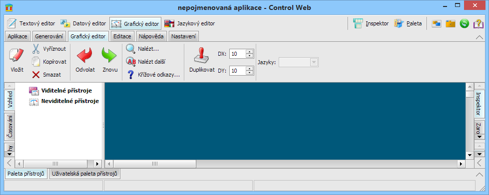 Samozřejmě nesmí chybět možnost ribbony skrýt a nechat zobrazeny jen záložky. Po kliknutí na záložku ribbon vyjede a nabídne uživateli své nástroje. Poté zase uvolní cenné místo na monitoru editované aplikaci. Vynaložili jsme velkou energii, aby toto rozbalování a skrývání pracovalo intuitivně a podle potřeb uživatelů, aniž by si to museli nějak uvědomovat. Zejména u dalších GUI prvků, které s ribbony sdílejí uživatelské rozhraní vývojového prostředí Control Web (např. paleta přístrojů apod.) a které používají techniky přetahování to není úplně triviální. Později se ještě se k tomuto problému vrátíme.