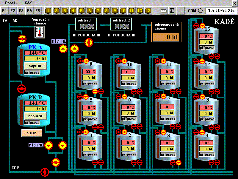 • Systém řídí a monitoruje výrobní proces v kvasírně lihovaru. Jedná se především o následující procesy: propagace(výroba kvasnic), zakládání předkvasných a kvasných kádí, chlazení kvasných kádí, dávkování odpěňovacího oleje, separace kvasných kádí. Jeho realizace je koncipována do několika fází, jejichž konečným řešením bude plně automatizovaná technologie. V současnosti systém umožňuje režim obsluhy (polo)automatický a ruční, v následujících dějích. Jednotlivá nastavení parametrů řízení se nastavují a zálohují prostřednictvím PC, které je předává komunikační linkou RS 232 řídícímu PLC. Celý průběh technologie je nepřetržitě monitorován na PC, kde jsou také mimo jiné archivovány hodnoty spotřeby výrobních surovin. Také je zde dále řízeno dávkování odpěňovacího oleje dle zvolených parametrů jako je perioda, velikost dávky a celkové množství.