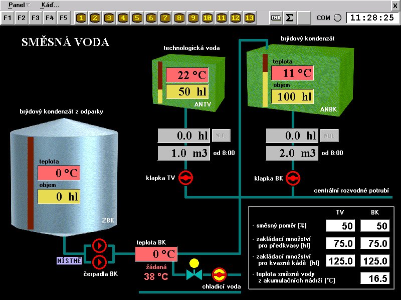 Panel "Směsná voda" slouží k ovládání a monitorování technologické vody a brýdového kondenzátu