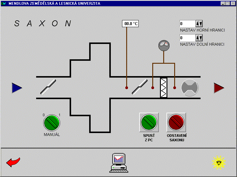 Systém řídí vytápění dvou objektů - kateder lesnické a zemědělské techniky. Kromě vytápění objektu katedra lesnické techniky navíc obsahuje řízení vzduchotechnické jednotky lakovny a katedra zemědělské techniky řízení vzduchotechnických jednotek výukových technologií brzd. U jednotlivých vzduchotechnických jednotek jsou motoricky ovládány vstupní a výstupní klapky a je hlídán tlak v systému před a za filtrem motoru, z důvodu možného zanesení filtru. Motory jsou spínány a u větších výkonů řízeny frekvenčními mněniči. Topné jednotky pro ohřev vzduchu jsou hlídány proti zamrznutí. Všechny vzduchotechnické jednotky pracují automaticky v závislosti na teplotách v místnostech a nastaveném algoritmu pro ohřev a výměnu vzduchu. V každém řídicím uzlu je instalován průmyslový automat Mitsubishi Melsec, propojený sériovou komunikační linkou s operátorským počítačem v objektu katedry zemědělské techniky a druhým operátorským pracovištěm umístěným u energetika. Operátorské pracoviště katedry zemědělské techniky a energetika mají stejnou prioritu pro nastavování parametrů vytápění řízených objektů. Řízení vzduchotechnických technologií umožňuje pouze pracoviště katedry zemědělské techniky. Pracoviště energetika podává informace o stavu těchto technologií, bez možnosti vnějšího zásahu do jejich ovládání. Vizualizace a řízení u obou operátorských pracovišť je řešena v prostředí systému Control Web.