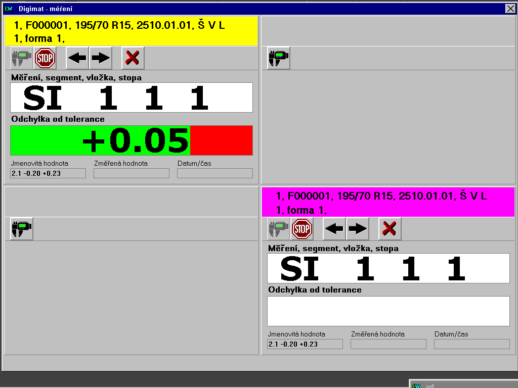 Systém umožňuje měření a vyhodnocování kontrolních měření forem pro výrobu pneumatik. Do počítače jsou zadány parametry formy. Měření prováděné měřicími přístroji je on-line vyhodnocováno. Výsledky jsou archivovány a zpracovány do protokolů. Program obsluhuje čtyři měřicí pracoviště.