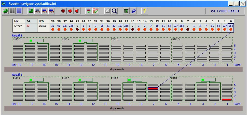 Systém je sestaven ze 130ti navigačních modulů. Moduly jsou vyrobeny na míru podle polic vyskladňovacích regálů. Každý modul obsahuje procesorovou jednotku obsluhující navigační LEDky. Jediná sběrnice RS485 (kroucená stíněná dvoulinka) spojuje všechny moduly s převodníkem RS485/Ethernet. Řídicí aplikace na počítači PC komunikuje přes Ethernet se všemi moduly. Každý modul je programovatelný a má v systému unikátní adresu. Na příkaz z počítače reaguje modul provedením požadované činnosti, přijetí příkazu potvrzuje zpět. Moduly mají délku polic v regálu a jsou namontovány tak, že pokrývají celou délku předních hran všech skladovách polic v celkové délce 390 metrů. Každá LED má své unikátní číslo a je označena čárovým kódem s tímto číslem.