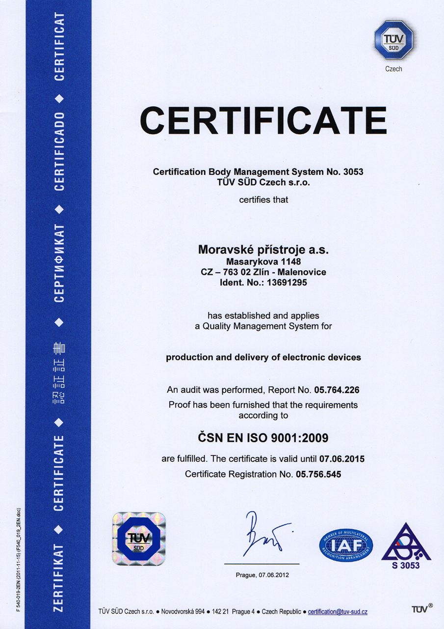 Moravian Instruments quality management system successfully passed the certification, which confirmed that it complies to ISO 9001:2001 standards.