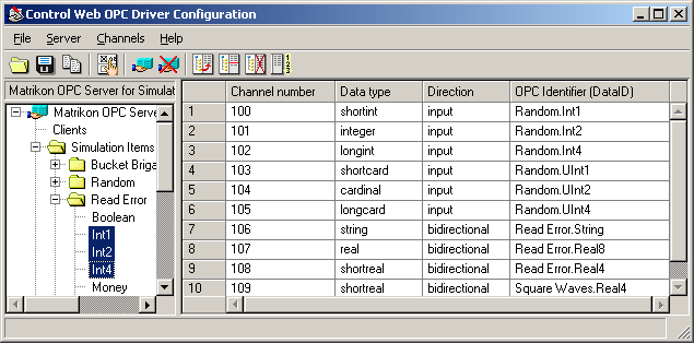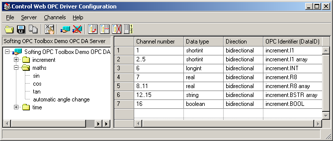 channels (OPC data identifiers) are available on the server.