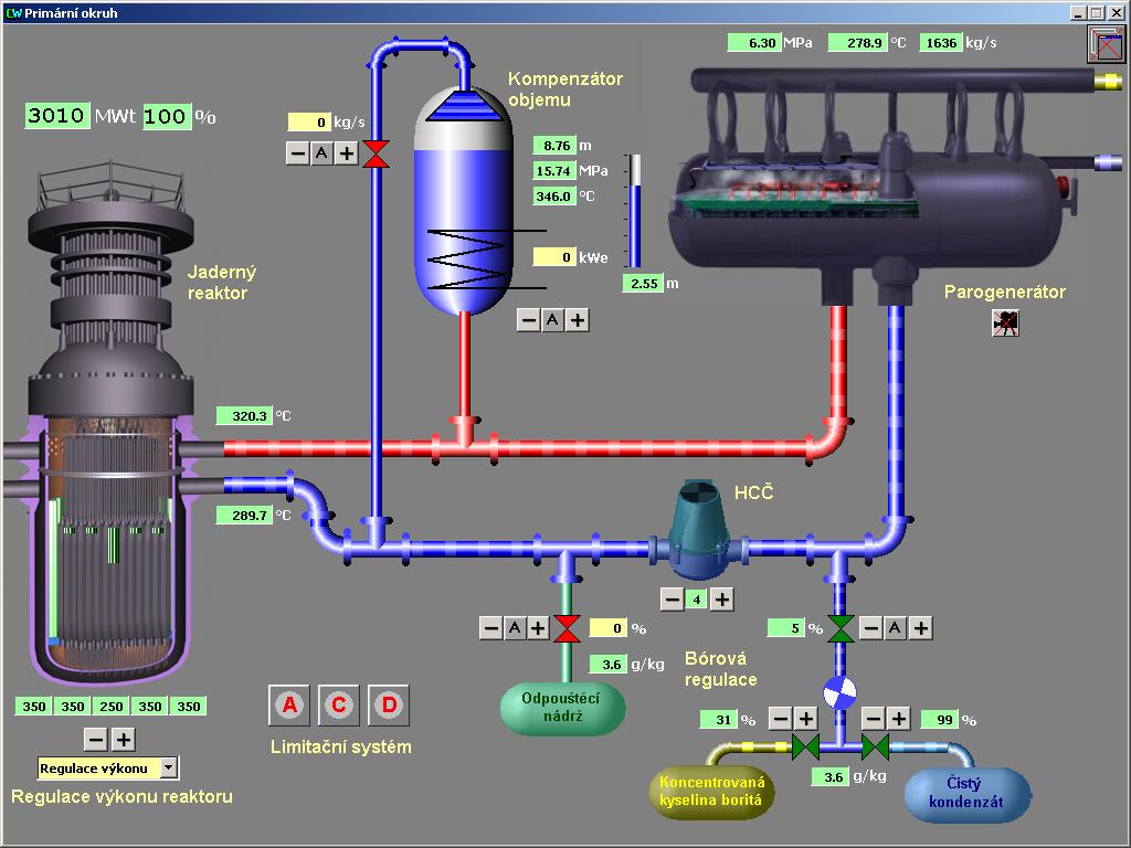 reaktoru. Uživatel programu může následně ovládat jednotlivé regulační