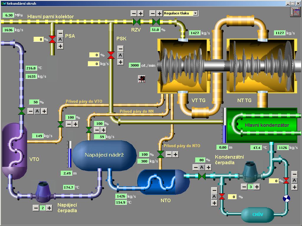 prvky simulátoru (regulační tyče reaktoru, regulační ventily,
