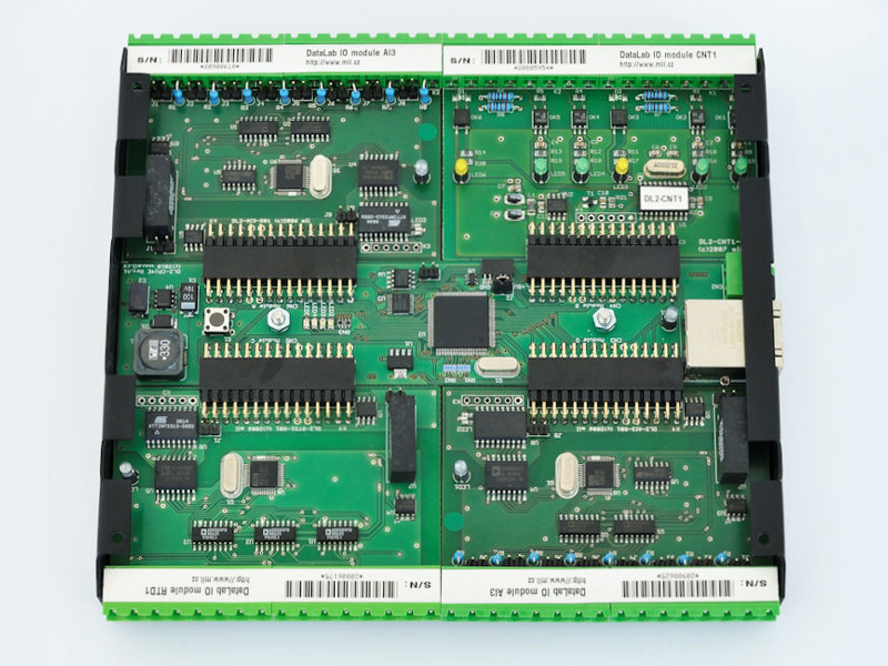 | Modular system of industrial input/output devices DataLab IO allows users to configure numbers, types and directions of measured and controlled signals to perfectly fit the particular application. All DataLab IO devices contain universal CPU core, to which are attached various I/O modules according to signal type (analog and digital inputs and outputs, counter inputs, relay modules, modules for platinum thermometers etc.). There are CPU cores for one, two and four I/O modules available. CPU cores with USB interface offer very easy application (USB is Plug-and-Play), simple connection with standard USB cable, the possibility to power the device through the same cable and fully automatic configuration. The disadvantage of USB connection is limited length to 5 m. This disadvantage is completely eliminated by new CPU core for four modules with 10/100 Mbit Ethernet interface. |