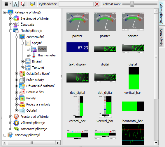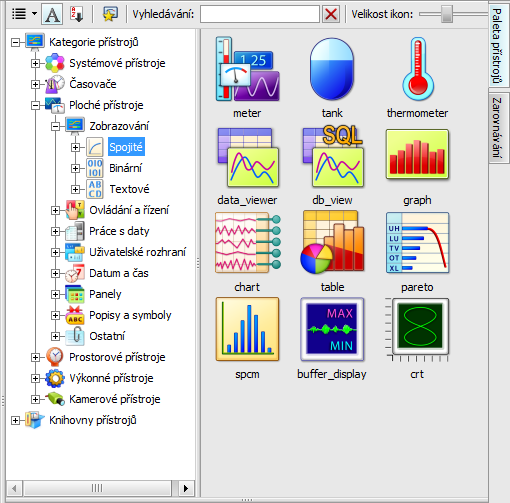Vybereme nástrojovou paletu Paleta přístrojů (stačí kliknout na záložku s jejím názvem). Standardně je tato paleta umístěna v pravé části vývojového prostředí. Protože paleta přístrojů je jednou z nejčastěji používaných palet, v hlavní nástrojové liště vývojového prostředí je pro ni vyhrazeno speciální tlačítko . Toto tlačítko paletu přístrojů vždy zobrazí, ať již byla pouze skryta pod jinou paletou nebo byla zcela neviditelná. Ujistěte se, že ve stromové struktuře v levé části panelu palety máte zvoleno Kategorie přístrojů (nikoliv Knihovny přístrojů). Chceme zobrazit spojitou veličinu, rozviňte tedy postupně větve stromu Ploché přístroje, Zobrazování a Spojité. Paleta bude vypadat následovně:
