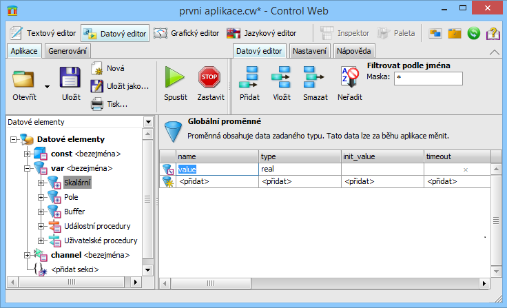 Ve vývojovém prostředí zvolte mód Datový editor. V aplikaci dosud neexistuje žádná datová sekce, v jejímž rámci by datový element bylo možné definovat. Pro naše účely potřebujeme prostou proměnnou schopnou uchovat spojité veličiny. Z předdefinovaných sekcí v podstromu v levé části plochy datového editoru zvolte var, což je druh sekce uchovávající proměnné. Pokud sekce var v podstromu dosud neexistuje, klikněte na položku <přidat sekci> a z nabízených druhů zvolte var. V rámci sekce může být několik druhů proměnných — jednoduché proměnné, pole proměnných a proměnné typu buffer. Zvolte jednoduché (skalární) proměnné a do tabulky v pravé části zapište jméno proměnné (např. value). Ještě je nutno zvolit datový typ. Spojité veličiny nejlépe reprezentuje typ real (reálné číslo).