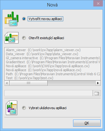 Po kliknutí na tlačítko se otevře se úvodní okno umožňující založení nové aplikace či výběr již existující aplikace pro další editaci. Také se nabízí otevření nějakého demonstračního příkladu. My ale chceme začít pracovat na nové aplikaci.