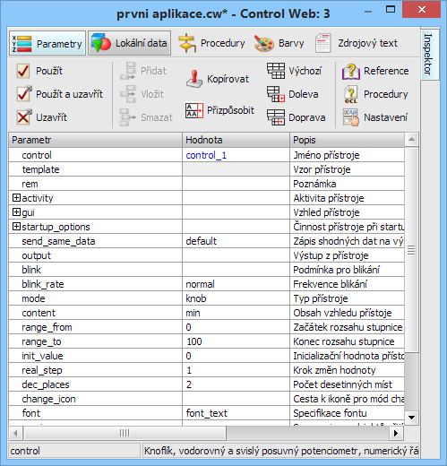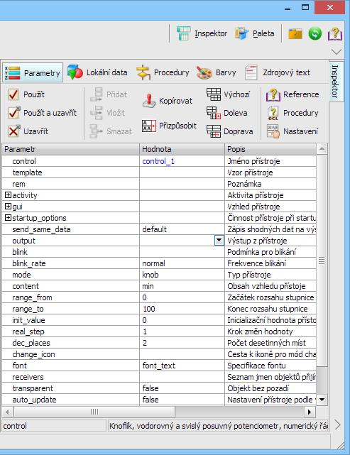 Parametr output specifikuje do kterého datového elementu bude hodnota zapisována. Jak víme, že zrovna u přístroje control je nutno nastavit parametr output? Inspektor zobrazuje ke všem parametrům popis, který pomůže s první orientací. Zanedlouho budeme základní parametry přístrojů bez problémů používat podobně jako např. při jízdě autem automaticky sešlápneme spojku a zařadíme rychlost.