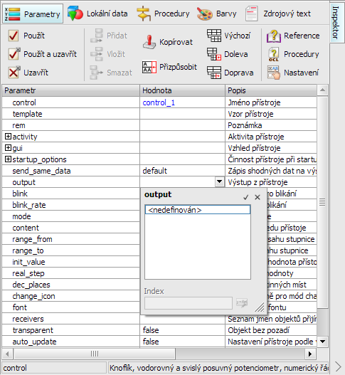 Inspektor přístrojů má několik módů, v nichž umožňuje definovat rozličné části daného přístroje. Zůstaňme zatím u prvního módu Parametry. V něm jsou zobrazeny všechny parametry, které můžeme u daného přístroje nastavit. Otevřeme tedy inspektor nad přístrojem control a vybereme parametr output.