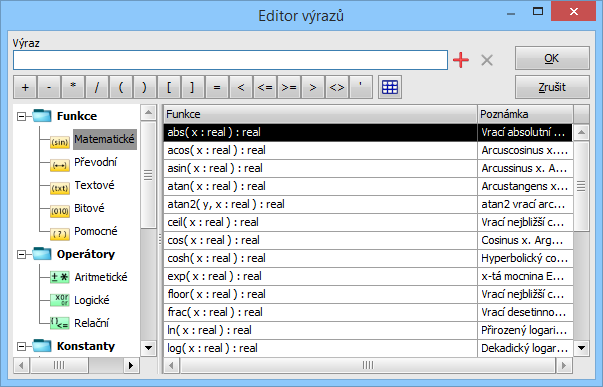 Tento rozdíl se samozřejmě projeví i pokud otevřeme pomocné okno parametru expression u přístroje meter. Inspektor nám nenabízí prostý výčet datových elementů, ale celý editor výrazů:
