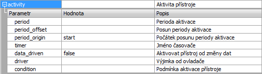Pokud otevřeme inspektor nad přístrojem meter, parametr period ve výčtu parametrů na první úrovni nenajdeme. Pro zvýšení přehlednosti nezobrazuje inspektor všechny parametry v jediném seznamu, ale některé logicky svázané skupiny parametrů zobrazuje v samostatných podtabulkách, které lze rozvinout a opět svinout. Příkladem takové skupiny je třeba právě skupina activity, která obsahuje parametry pro nastavení podmínek aktivace přístroje. Ve svinuté podobě je skryta v jediném řádku: