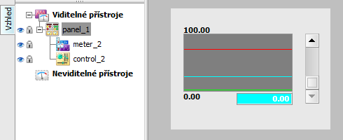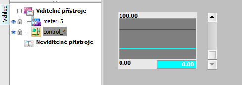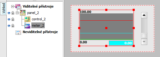 Aplikaci spustíme kliknutím na nástroj . Jakmile se aplikace rozběhne, zkuste nastavit hodnotu přístrojem control a sledujte jak přístroj meter hodnotu zobrazuje.