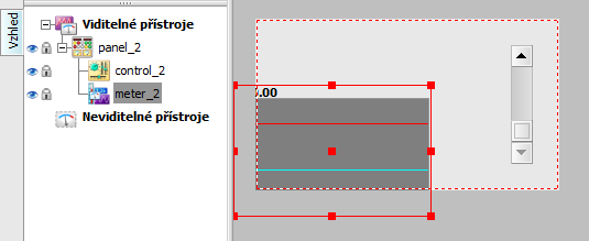 Grafický editor ukazuje obdélník vlastníka čárkovanou čarou. Pokud vybereme meter nebo control, obdélník panelu se zvýrazní čárkovaně.