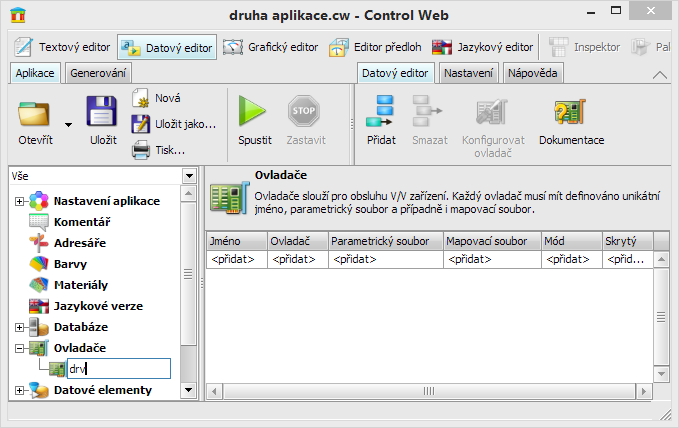 Ovladač do aplikace vložíme v záložce Datové inspektory vývojového prostředí. Ubezpečme se, že ve výběrovém seznamu vlevo nahoře je buď Vše nebo Ovladače. Pak můžeme kliknout do řádku <přidat ovladač> a napsat jeho jméno; v našem případě pojmenujeme ovladač třeba drv: