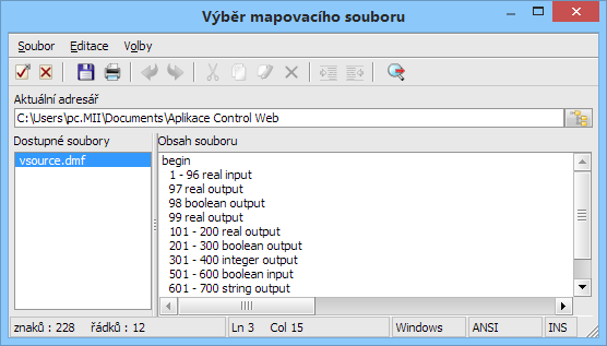 • Mapovací soubor — soubor s definicemi kanálů ovladače. Otevřeme pomocné okno Výběr mapovacího souboru, přepneme se do adresáře 'dmf' a vybereme soubor 'vsource.dmf':
