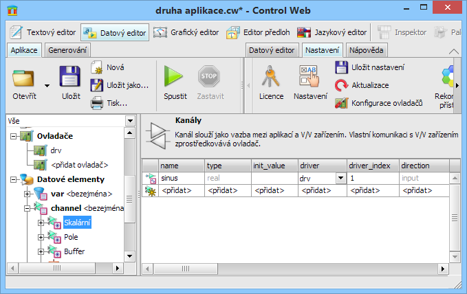 Pokud máme v aplikaci zaveden ovladač, můžeme definovat kanály. Podobně jako jsme v prvním kroku definovali proměnou (napřed bylo potřebné založit sekci proměnných a poté v této sekci založit proměnnou), založíme sekci kanálů channel a v této sekci vytvoříme kanál sinus: