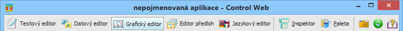 Protože aplikace ve zdrojovém tvaru je vždy uložena v textové podobě, první editor nabízený vývojovým prostředím je Textový editor. Teoreticky lze jakoukoliv aplikaci v systému Control Web vytvořit jen s pomocí textového editoru, pokud by uživatel znal všechny parametry všech potřebných komponent, datových sekcí atd. Vzhledem k rozsahu to je zřejmě velice obtížné a jistě i neekonomické a proto nabízí Control Web další editory, které tvorbu aplikací výrazně usnadňují a urychlují. My budeme dále pracovat v režimu grafického editoru a jeho podpůrných příkazových i nástrojových palet. Ubezpečme se tedy, že v nástrojové liště je vybrán Grafický editor (je zvýrazněno tlačítko ).