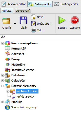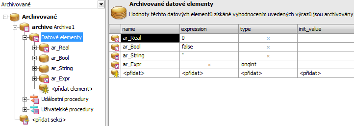 Nejpřirozenější, nejjednodušší a prakticky bezstarostný způsob archivace v systému Control Web je systémová archivace pomocí archivních datových sekcí (sekce archive). Archivní datové sekce se definují v záložce Datové inspektory v položce Datové elementy.