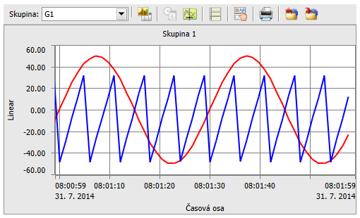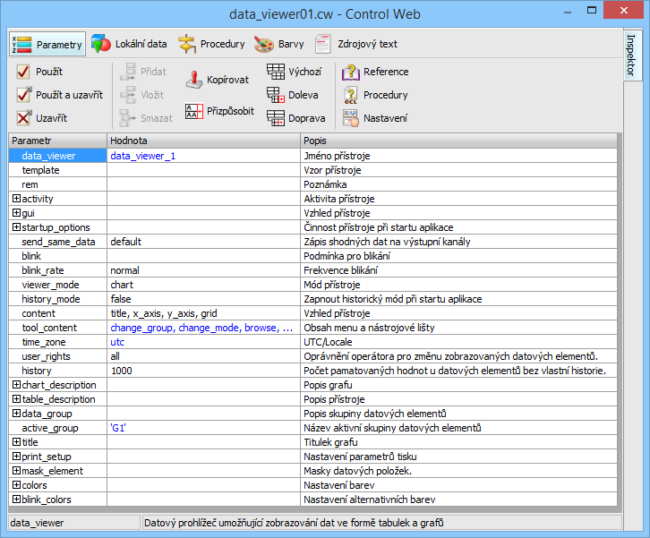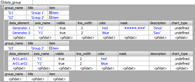• item — seznam datových elementů skupiny. Datové elementy jsou identifikovány plným jménem, t.j. názvem archivní sekce odděleným tečkou od názvu datového elementu. Na místě názvu datového elementu mohou být použity také hvězdičkové konvence pro hromadná jména. Hromadné jméno pak musí být uvedeno v apostrofech. Datové elementy typu pole nelze do skupiny zařadit jako celek, lze však vkládat jednotlivé prvky pole. Pro každý datový element je pak možno zadat identifikátor (jméno) osy y axis_name, tloušťku čáry grafu line_width a barvu, kterou bude průběh vykreslován color. Parametr mask definuje masku pro zobrazení číselných hodnot elementu v informačním okně časového kurzoru a v módu viewer_mode = table. Parametr description definuje textový řetězec popisující datový element v legendě grafu a v informačním okně časového kurzoru v módu viewer_mode = chart. Každý průběh může vykreslován jiným typem čáry. Ten je definován parametrem chart_type. Pokud je tento parametr nastaven na hodnotu undefined, je průběh vykreslován typem definovaným globálním parametrem chart_type definovaným v sekci chart_description. Viditelnost průběhu v módu chart je určena parametrem visible.