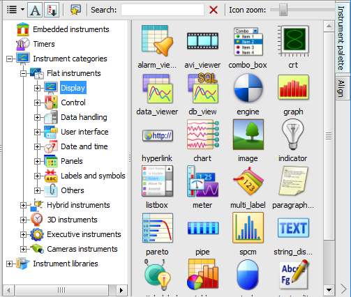 The Instrument Palette is a fundamental part of the development environment, therefore, it contains a lot of information. First of all, the palette is divided into the left part with instrument categories displayed in tree and the right part offering individual instrument classes. The left part (tree) offers two ways to organize components (instruments) — it is possible to choose the preferred view using the combo-box above the left pane.