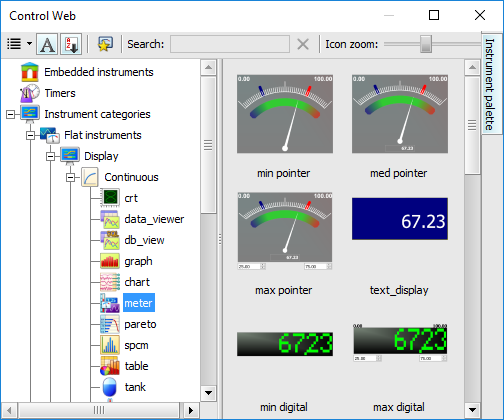 • Instrument categories, a view created according to the importance and the function of individual instruments. Instruments of similar functions are grouped into categories, inside these categories instruments are sorted according to imaginary complicacy. Because the Control Web offers two principally different manners of visualization (2D and 3D), two of the main categories are Flat instruments and Spatial Instruments. Executive instruments are all instruments that are not visible (they do not serve for visualization), System Instruments are internal instruments and instruments used only for calling system functions.