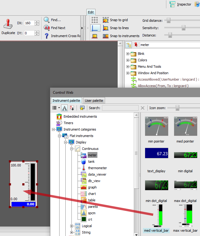 Selection of a suitable instrument by means of the palette is the first step (often repeated) for the creation of an application. After it, there is the second step, which is inserting the new instrument into the application. This operation in the Control Web is direct — by dragging the mouse. It is enough to click on the selected instrument and drag it into the suitable place of the graphics editor.