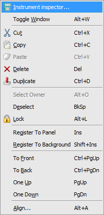 Operations by means of the context menu are easily accessible. The first item of the menu Instrument Inspector... is for the Control Web crucially important. The Instrument Inspector is the basic way to modify the properties of instruments.