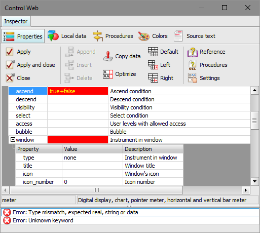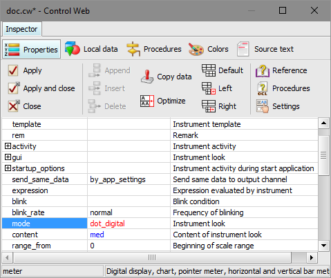 If the inspector is opened above the group of selected instruments, only such parameters are offered for modification in which instruments are identical. Therefore, if you open the inspector, for example, above a pair of instruments meter and control you will always see a smaller quantity of parameters than the parameters meter and control really have.