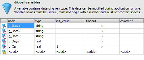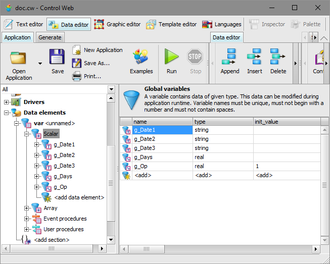 The application (and the instruments in it) needs to achieve technological data (either for the demands of visualization or for the demands of control). Similarly, somewhere it needs to store the calculated states and internal values. Therefore, it is necessary that some data in the application and in the Control Web are represented by various types of data elements. There are many data elements, but all data is defined and modified in a uniform manner. However, since in the Control Web there are data elements of various levels (global, instrument and procedural), they are edited at various levels (in a uniform manner).
