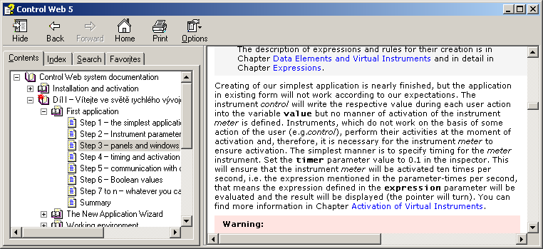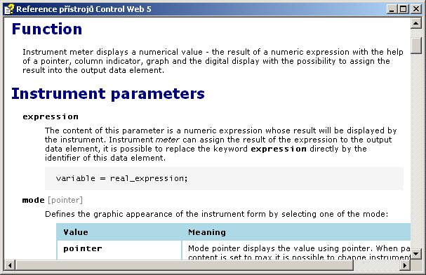 The component which is used for display of the documentation in the Control Web (described windows with documentation) is not part of the Control Web, so its appearance (and also language) may change according to the version of your operating system. For example, it is probable that in the English operating system windows with documentation will be in English.